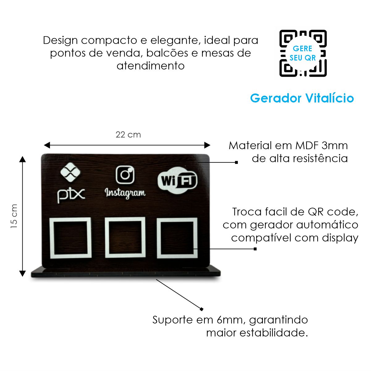 * Enviamos um recado com as dicas pra você gerar o seu próprio QR CODE (você vai conseguir gerar seu QR de forma simples e rápida já com as medidas do display) – Assista ao vídeo.